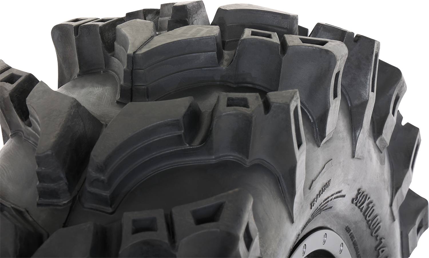 Aggressive V lug tread digs deep while offering a smooth ride on hard pack surfaces1.5" tread depth in the center, up to 2.0" on the shoulderDeep rim guard protects your wheel
