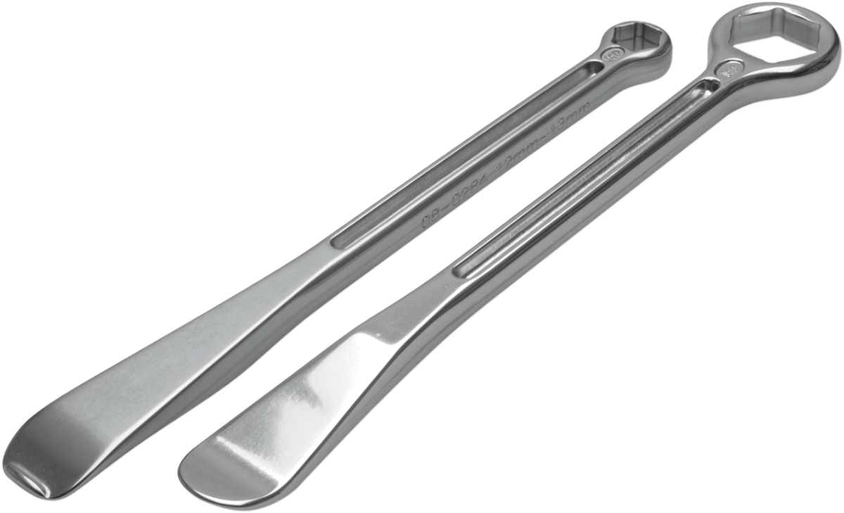 • Perfectly contoured tire lever on one end and a unique combination stepped 12 mm - 13 mm box end wrench on other end for turning rim lock nuts or a hex box wrench sized for axle nuts on other end