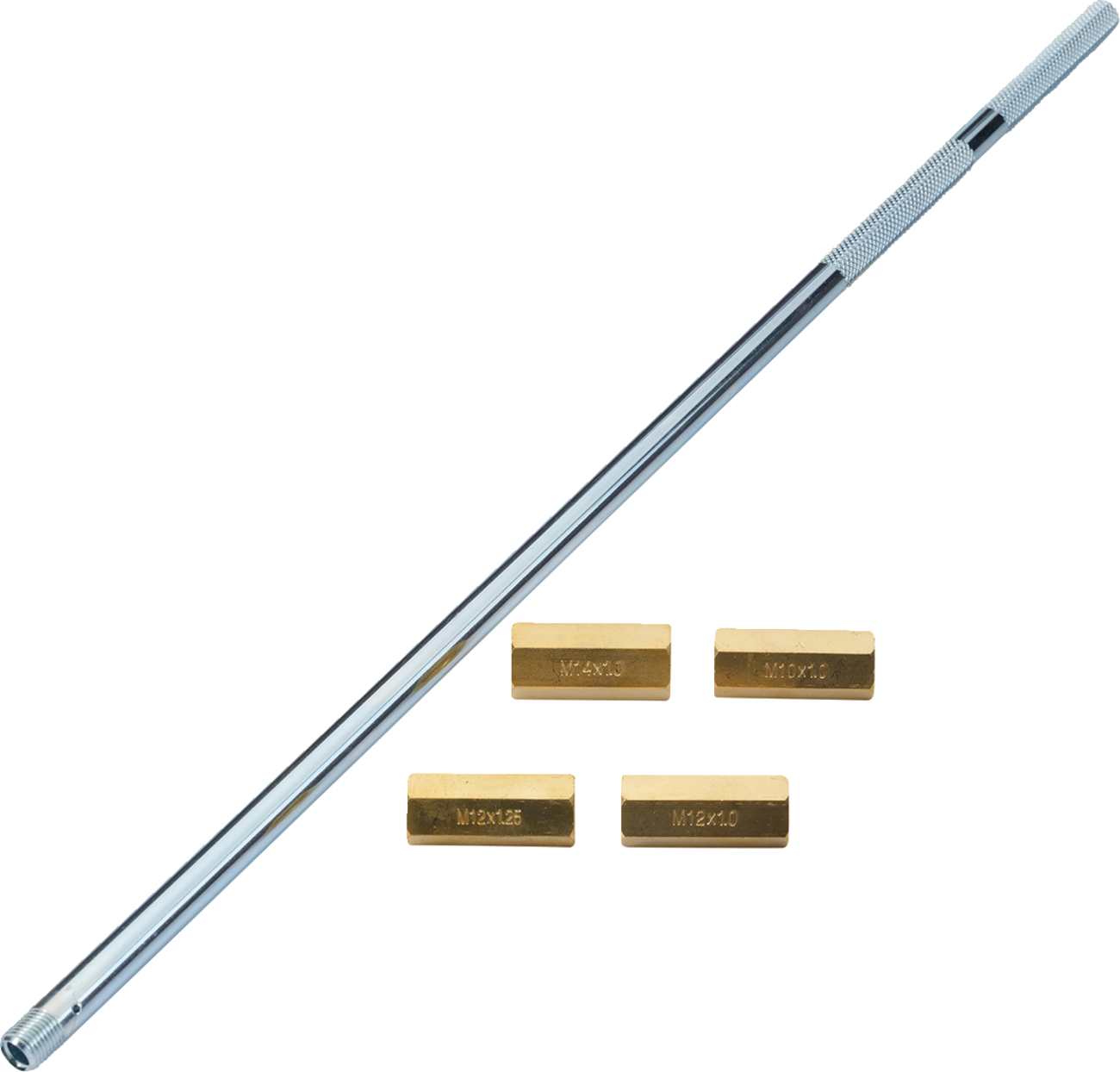Tool provides one rod with M10 x 1.0 end and 4 brass hex adaptors included: M10 x 1.0, M12 x 1.0, M12 x 1.25, and M14 x 1.0Allows for effortless retrieval of the dampening rod after spring installationRod includes covered bleed port to prevent oil splatterWorks on Kayaba, Showa, and WP inverted forks
