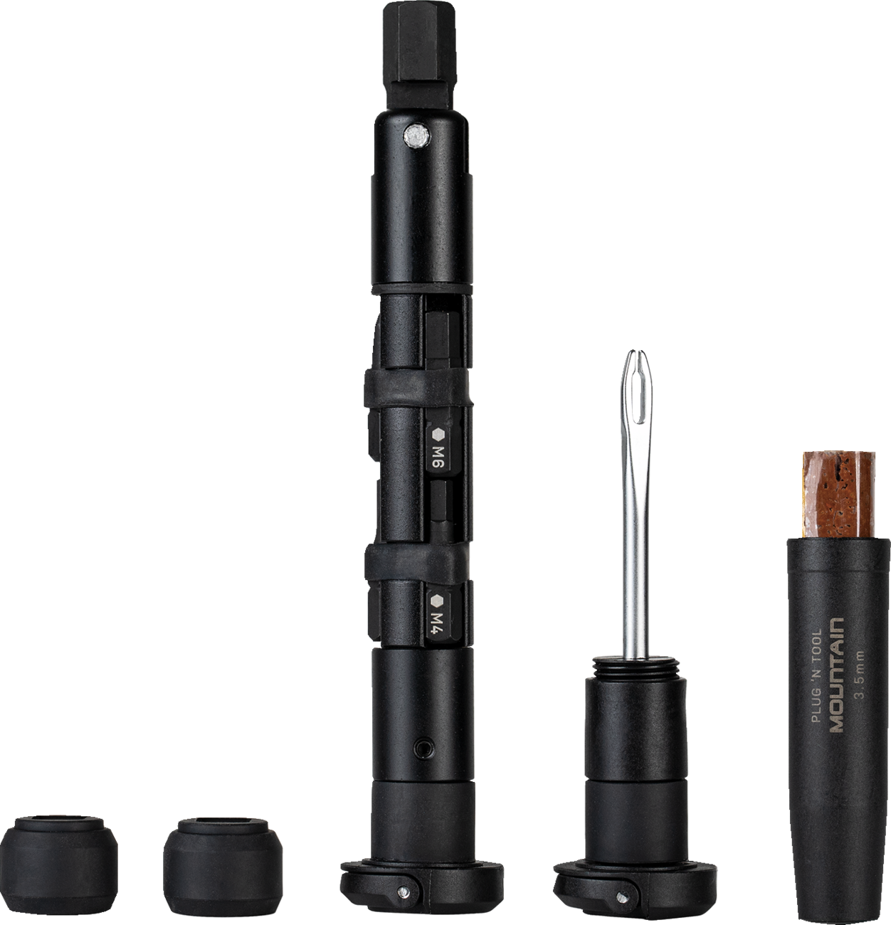 7-function folding tool and tubeless repair kit (3.5 mm plug insertion tool, 3 pieces of 3.5 x 50 mm plugs)Two easily accessible hidden compact tool kits housed in your handlebar endsComes with 3.5 mm plug insertion tool for tubeless tire repair and a full set of 3 / 4 / 5 / 6 / 10 mm Allen bits, T25 Torx® bits, and #2 Phillips bit for bike maintenanceStealth mount in handlebar endsCompatible with handlebars with at least 128 mm straight section and inner diameter 18 - 21.2 mmMaterials — Hardened steel / Engineering grade polymer