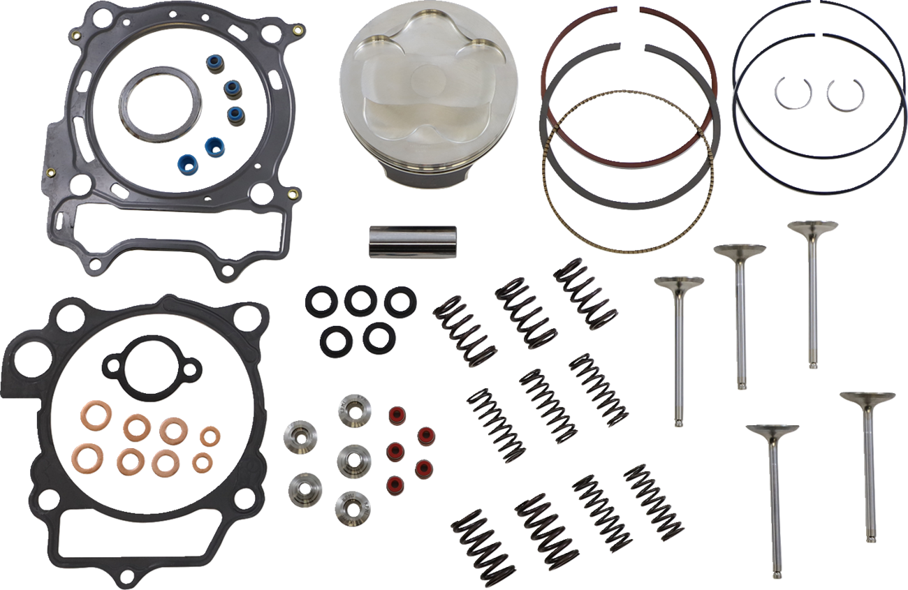 • Kit includes: piston, rings, clip and pin, Cometic top end gasket kit, Black Diamond engine valves (standard size) and dual spring titanium retainer springs (.395" lift intake, .0370" lift exhaust)