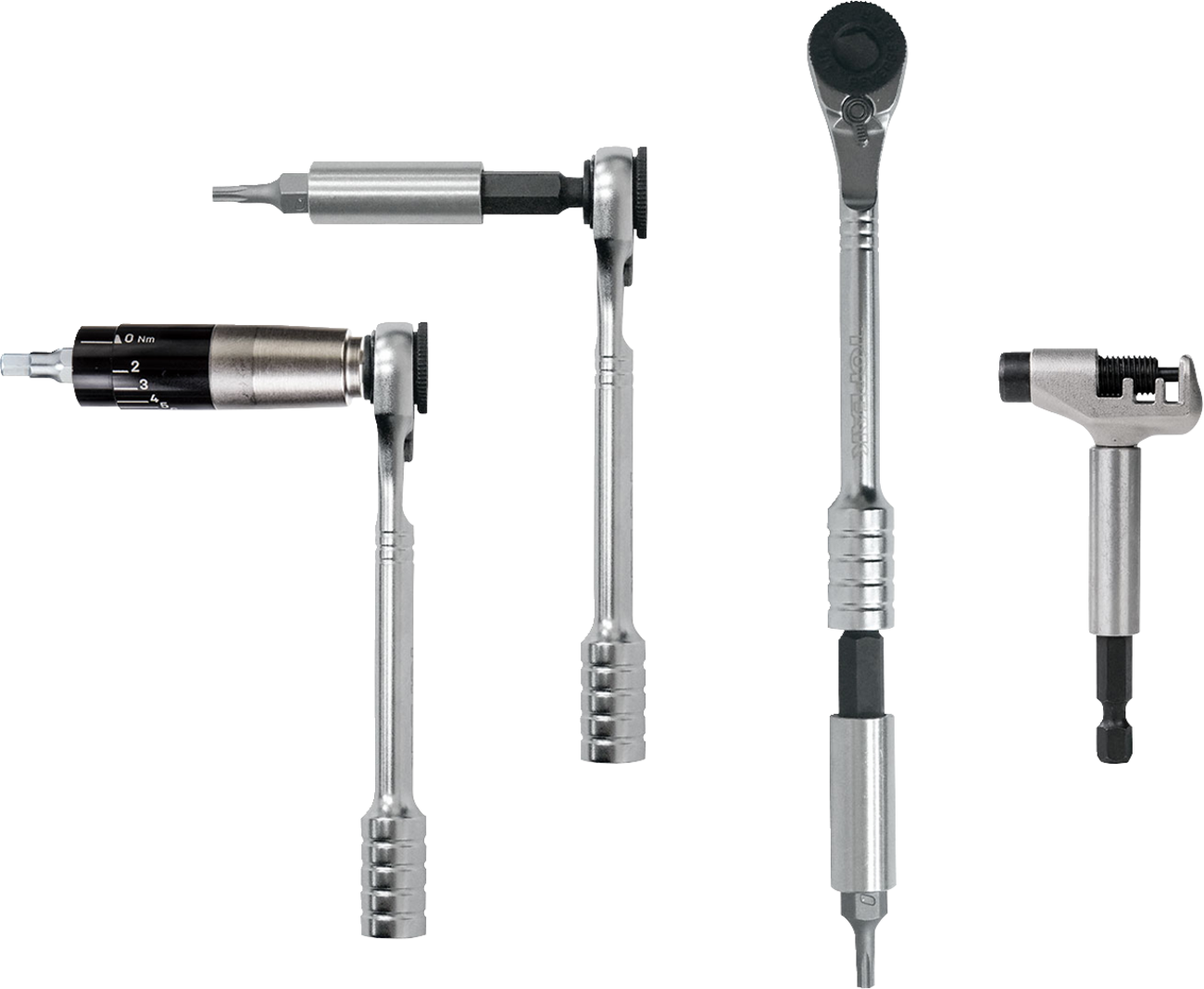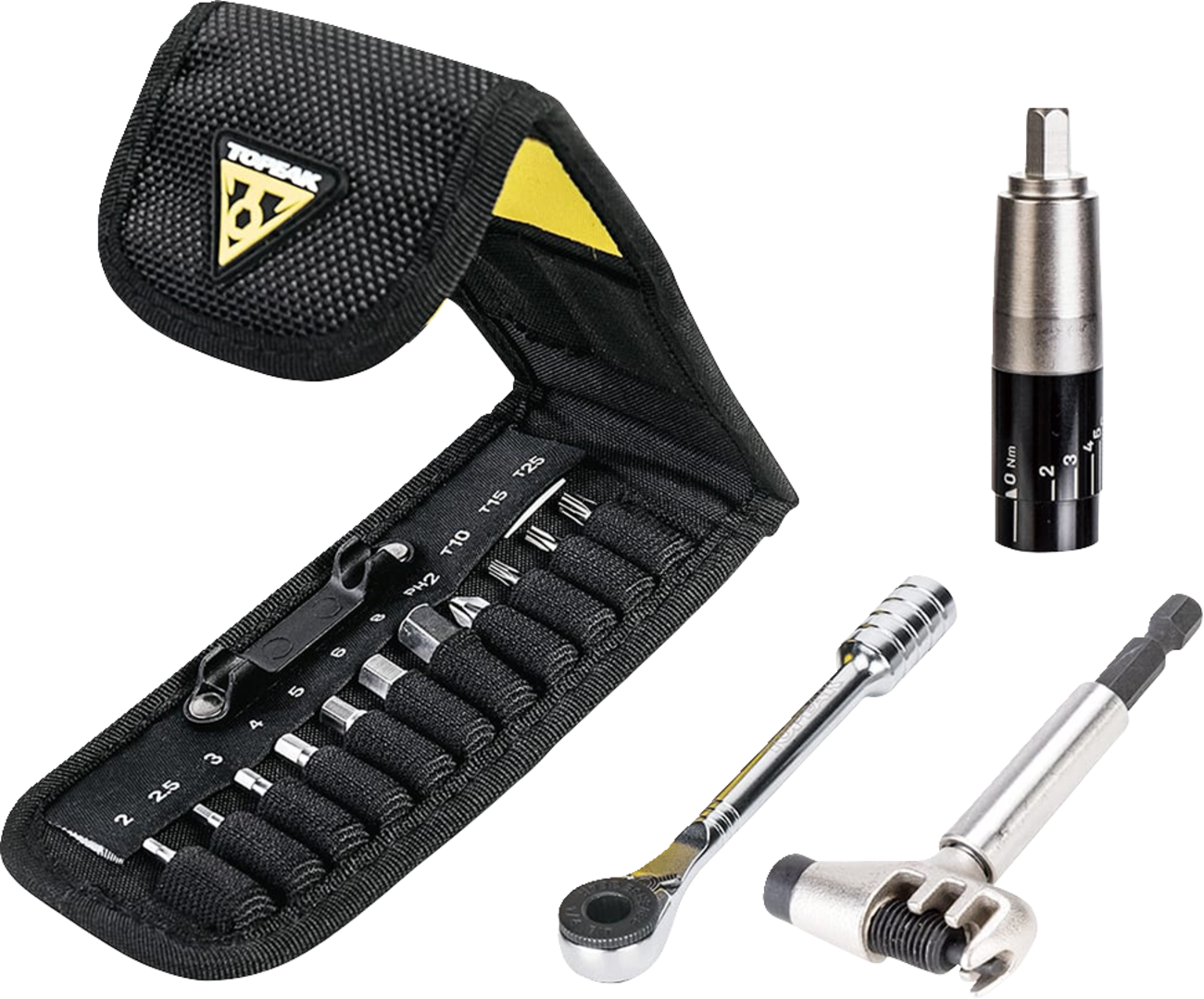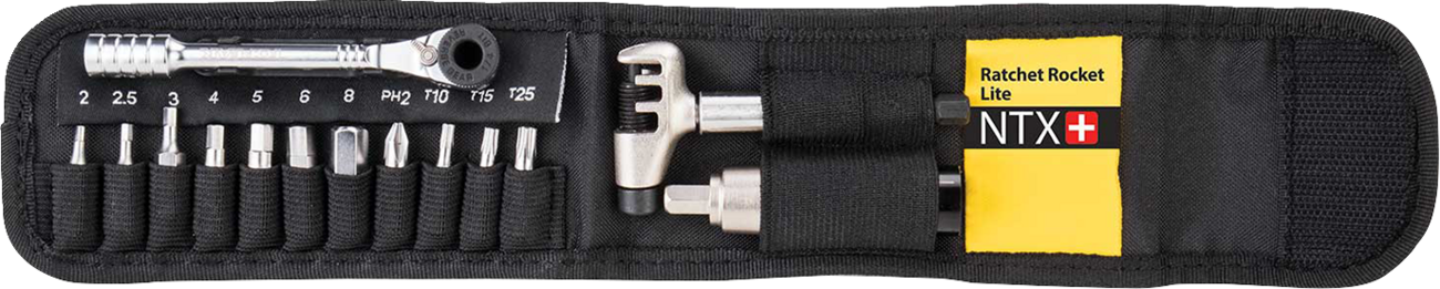 The Ratchet Rocket Lite NTX+ has everything you need to fix and make precise adjustments to your bike while on the roadFeaturing a fine tooth ratchet mechanism with reverse lever and thumb wheel with adjustable torque (2 Nm - 6 Nm) TorqBit for ease and accuracy in tight spotsThe protective case keeps things organized and secure, and even has a pocket to carry glueless patchesAdditional features include a screwdriver, chain pin breaker, added leverage, patch pocket, and magnetic bit holderIncludes magnetic bit holder, hardened steel tools in 2, 2.5, 3, 4, 5, 6 and 8 mm hex, T10, T15, T25 Torx®, #2 Phillips bits and CrMo steel chain tool*