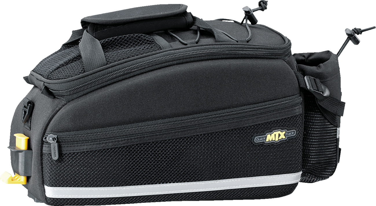 MTX QuickTrack compatible Trunk bag featuring a divided main compartment constructed with process of combining rigid panels and flexible fabric for structure and water repellencyFeatures two mesh side compartments for extra capacity and rear water bottle holder lets you carry more water on extended tripsAlso features shoulder strap, carrying handle, elastic top bungees, 3M reflective strip, safety light clip, and option rain coverMax load limited to rack max load rating