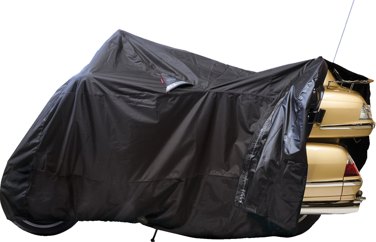 Eliminates hassles associated with putting a cover on a bike or removing itA zipper located at the rear of the cover makes installation and removal fast, easy and convenientConstructed of heavy-duty polyester material for long-lasting durabilityClimaShield™ Plus fabric coatings ensure water repellency and UV stability and retard the growth of mildewExclusive Moisture-Guard™ venting system prevents the accumulation of unwanted moisture under the coverScorch-resistant aluminized heat shield panel allows the cover to be put on the bike before the pipes have cooledUnique locking grommets facilitate the use of a cable lock to secure your motorcycleElastic cord sewn into the hem of the cover ensures a snug fitSpecial soft cover liner in the area of the motorcycle windshield protects against possible scratchingEZ On and EZ Off zipper makes installation and removal of the cover hassle-freeIncludes convenient storage bag