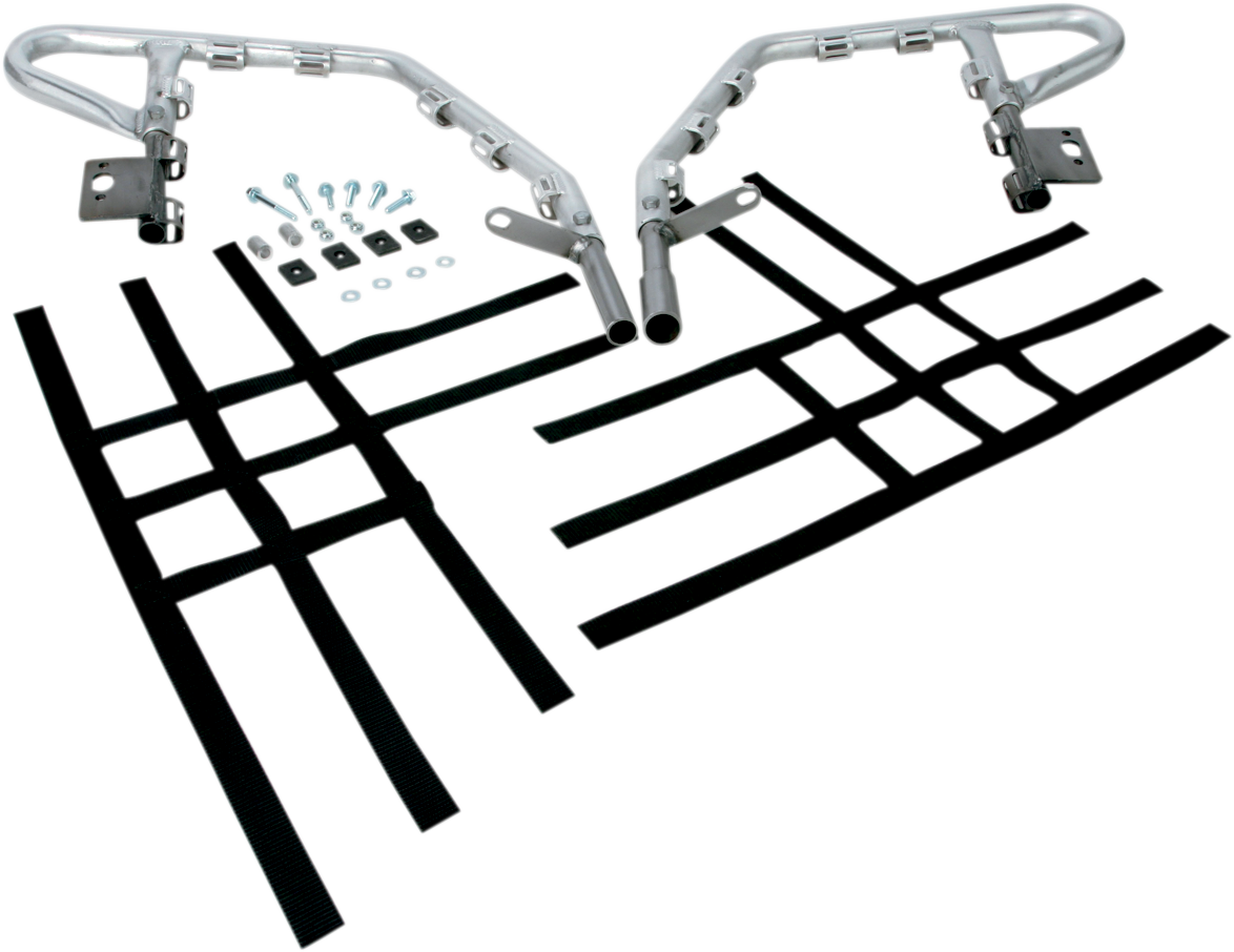 The latest in nerf bar technology combines lightweight aluminum tubing with high-strength steel brackets for the ultimate nerf bar1-1/4" alloy tubes are heli-arc welded at the joints4-gauge steel mounting bracketsThe highest tensile-strength webbing is used for maximum safetySpecs