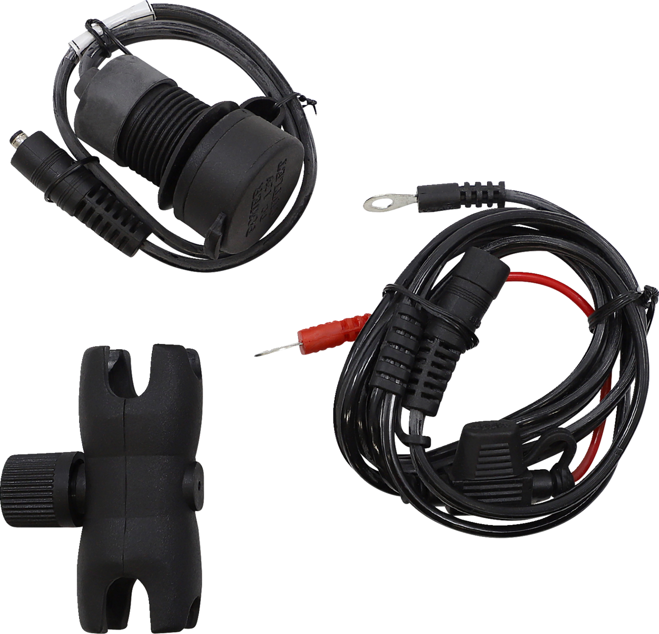 Stylish looking handlebar mount comes with 5 volt/2 Amp dual USB ports, 1" ball attachment (for attaching RAM mount accessories) and water-resistant safety cap with built-in switch1" ball attachment can be used to attach any RAM products or aftermarket accessories and provides convenient mounting, charging and playing options for your smartphones, GPS or MP3Rear of the mount has 15" wire with male coax on the other end with a 48" long battery cord to provide enough lengthWater-resistant cap has a hidden built-in switch, which switches off the dual USB built-in lighting and power drain when the cap is closed, protecting your battery drainDouble socket arm for 1 ball, which can be used with any aftermarket or RAM 1 ball accessories; length of approximately 3This socket design with 4 side slot opening on both sides allows for almost infinite angle adjustmentAble to be connected directly to battery terminals without doing tedious connection through ignition switch wiringHandlebar mount fits 7/8", 1" and 1.25" bars with required spacers for all three sizes