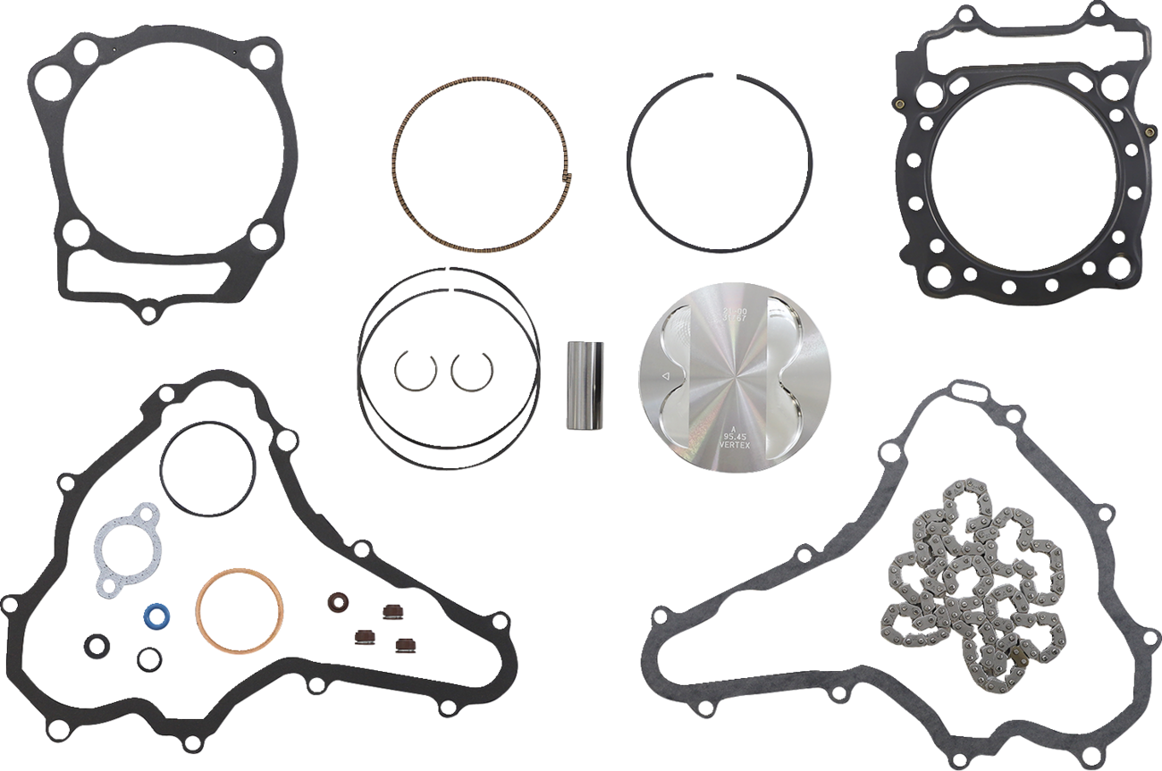 The piston is heat-treated with a T-5 hardening and tempering cycleThe piston skirt is coated with high-tech Molybdenum Disulphite to allow faster break in time and increased piston lifeForged piston kit is forged from 2618 aluminumForged replica piston is a forged OEM replacementTop-end piston kit includes piston, rings, pins, circlips, top-end gaskets and cam chainSpecs