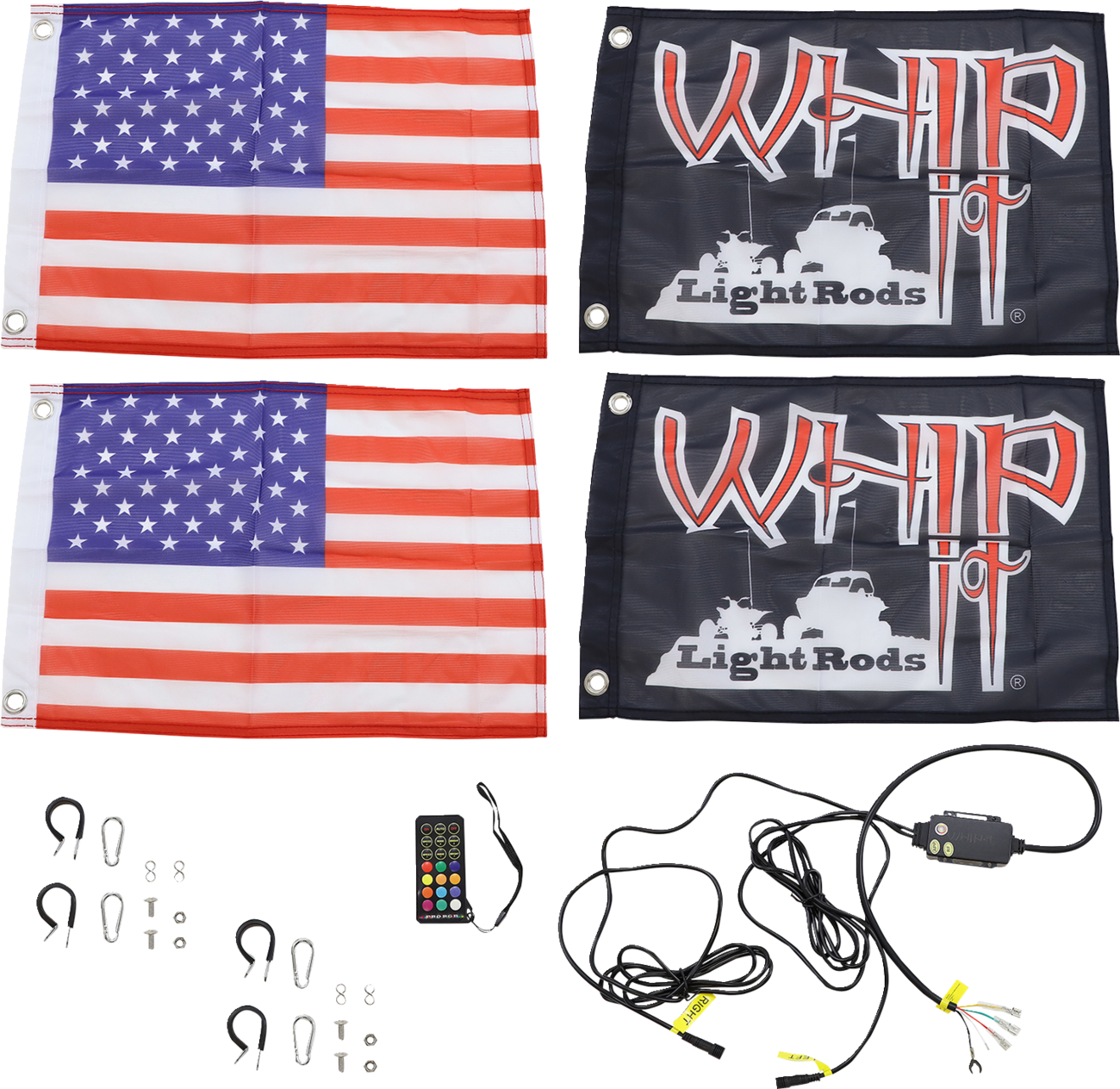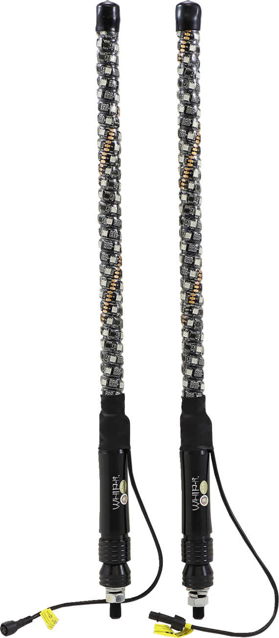 360° of Awesome Color - Insanely bright LEDs always ensure you’re visible and a unique spiraled design means you get more LEDs per foot of whipEasy Removal – Non-Rotating Quick Disconnect Base with 6063 Aviation AluminumChasing function with 300 different colors and 200 patterns, including flash, strobe and fade-through-colors, stream, cascade and different color combinations from top, bottom and middle; adjust speed/brightness or lock on one colorBluetooth® control via a free, easy-to-use App. App provides ultimate functionality including music synchronization, color, pattern and light effect customization, color brightness and speed control, and group LED controlIP 67 Dust and WaterproofIncludes remote, wiring harness, Black Whip It flag, American Flag and hardware