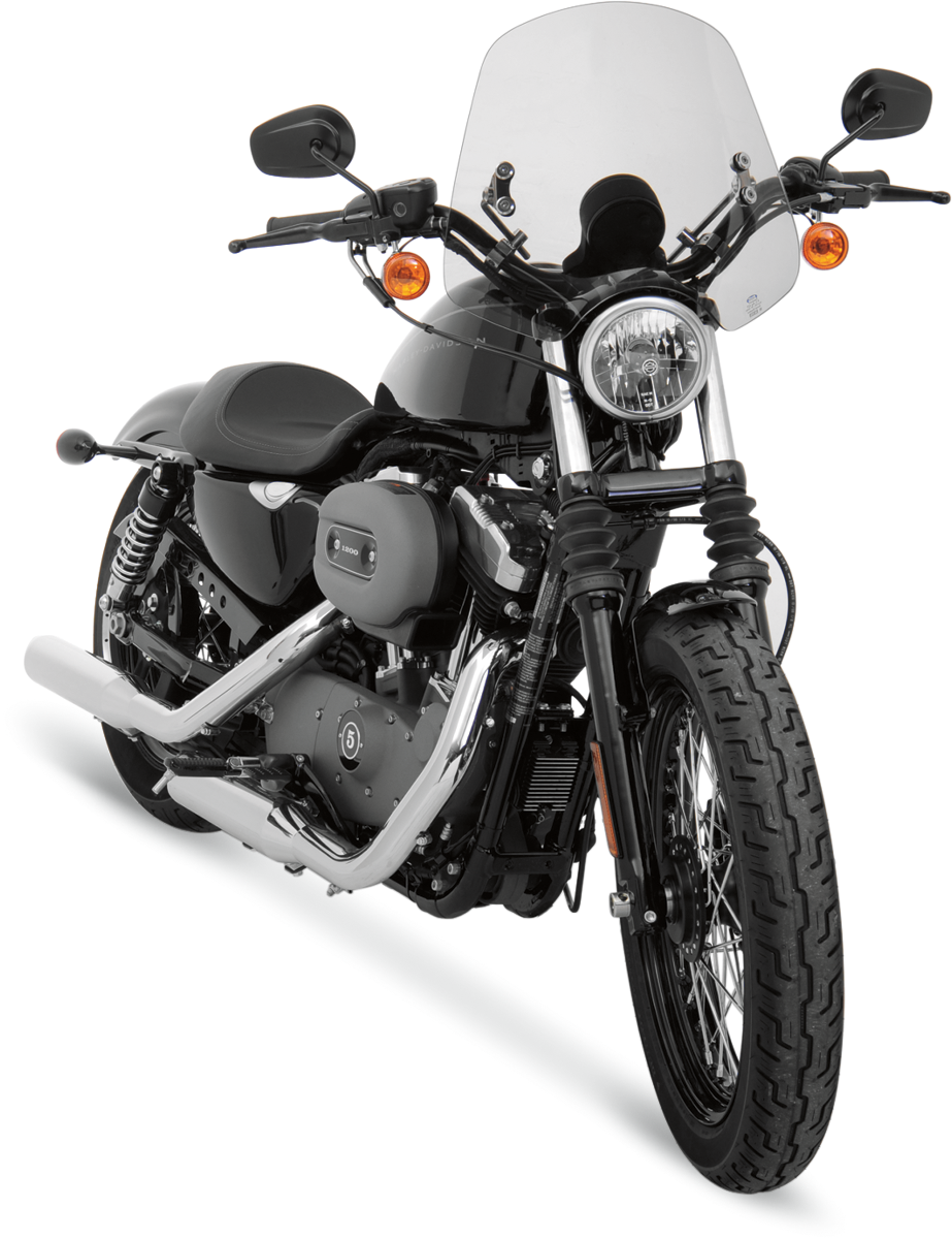 • Included two-point mounting hardware consists of polished billet aluminum handlebar clamps that fit 1" and 7/8" handlebars (with sizing band), aluminum rake plates and bushings, stainless steel support rods and socket-head screws