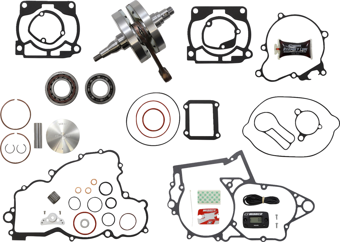 Includes all top and bottom-end components for a complete engine rebuild4-stroke kit includes a premium forged piston kit with stock compression ratio and a high-quality cam chain2-stroke kit includes a Pro-Lite® pistonCrankshaft and rod assembly designed and inspected to assure durabilityKit includes main bearings, seals, gaskets, an hour meter and bracketSpecs