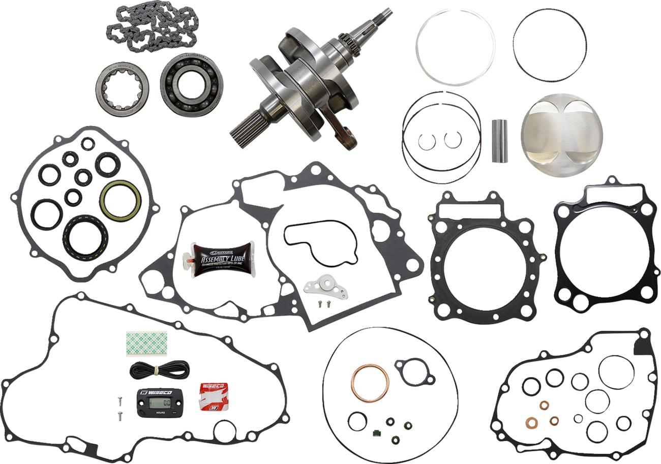 Includes all top and bottom-end components for a complete engine rebuild4-stroke kit includes a premium forged piston kit with stock compression ratio and a high-quality cam chain2-stroke kit includes a Pro-Lite® pistonCrankshaft and rod assembly designed and inspected to assure durabilityKit includes main bearings, seals, gaskets, an hour meter and bracketSpecs