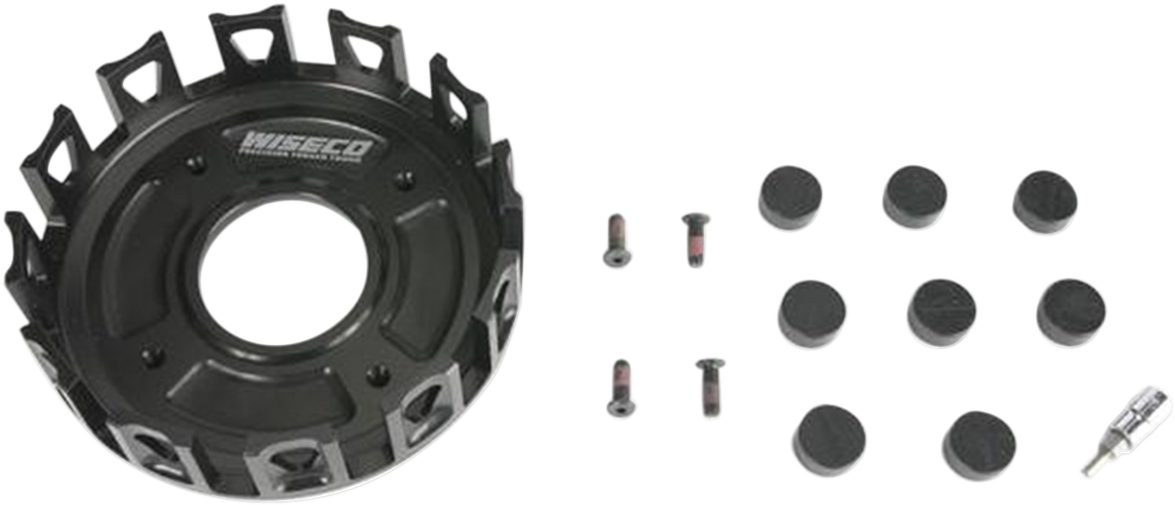 Forged from lightweight aerospace-grade aluminum alloy; CNC machining ensures each clutch basket is identical to the nextWeight-saving relief cuts on outside of clutch reduce rotational mass, allowing engine to rev quickerLarge oiling holes increase lubrication and reduce heat buildupPTFE coating makes for a near-frictionless surfaceCome with fasteners complete with pre-applied thread lockerSpecs