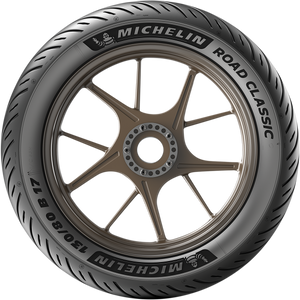 50% more wet grip than the previous generation - A compound mix incorporating Silica Rain Technology (SRT), an innovation which combined with a 26% void ratio gives 50% more wet grip than the previous generation [In-house comparison of the average wet lap times of the Michelin® Road Classic (1'02.81 seconds) and Michelin® Pilot® Activ (1'07.50 seconds) tires conducted on 6/16/2020 at Fontange track (1,2km) in France with front dimension 100/90B19 and rear dimension 130/80B17 on a Triumph® Bonneville T100.] Actual on-road results may varyIncreased cornering and straight-line stability than the previous generation - Thanks to its bias ply technology and bias casing supported by two crown plies the Michelin® Road Classic tire provides 50% more stability when cornering and 40% more straight-line stability than the previous generation [In-house subjective comparison of the Michelin® Road Classic and Michelin® Pilot® Activ tires at maximum vehicle speed conducted on 6/22/2020 at the Ladoux track (France) with front dimension 100/90B19 and rear dimension 130/80B17 on a Triumph® Bonneville T100.] Actual on-road results may varySportiness - Great performance and looks thanks to the sport motorcycle tire inspired tread patternModern technologies to make the most of your classic bikeTubeless (TL)Blackwall