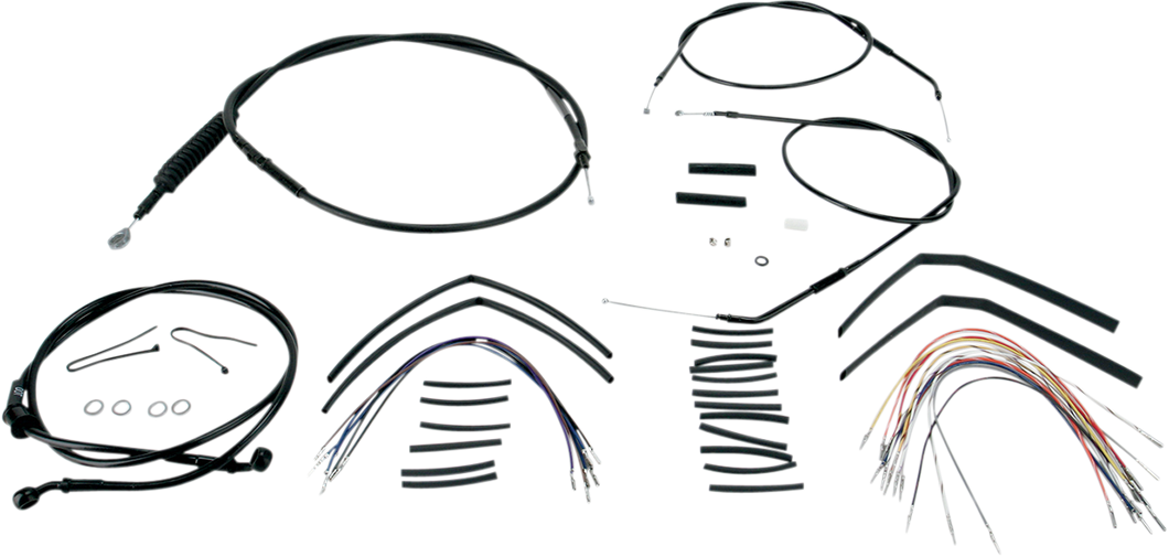 Complete installation kit for Burly Ape hangersKits include extended brake line (unless noted), extended clutch cable/clutch line, extended throttle/idle cables as required and all necessary wiringBrake lines, when included, feature PTFE inner liner and heavy-duty stainless steel outer braidDresser kits reuse stock Throttle-By-Wire harnessSpecs