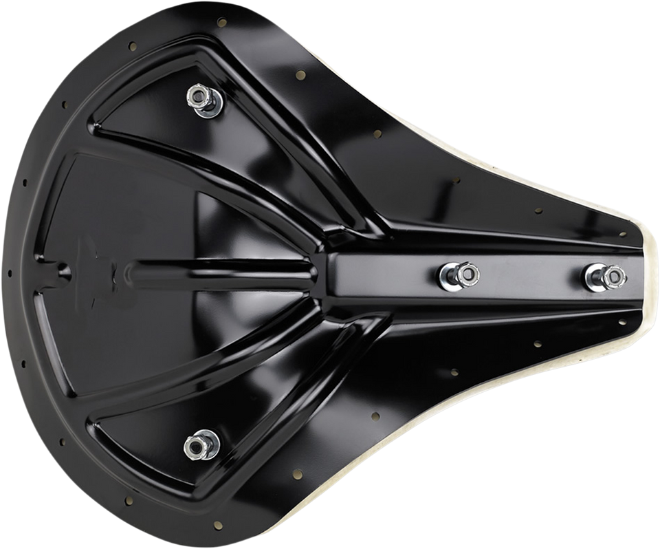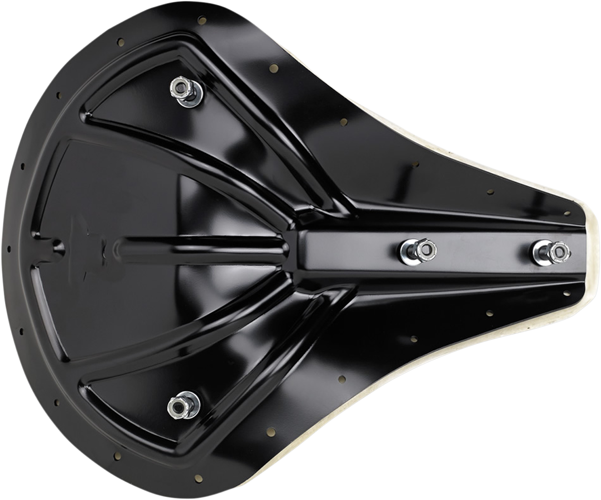 1/8" thick stamped steel pan with welded carriage bolts on nose and tail for spring and hinge mountingStamped-in ridges on the pan increase stiffness and give the pan a clean, classic look with a matte black electroplated finishCovers are made of hand-stitched heavy-duty black vinylFoam is molded polyurethane, approximately 1” thickCompared to the original Solo seat, the new Solo 2 has a shorter overall length and two more inches of kick in the tail to deepen the seating area and improve its visual flow on bikes with steep backbones