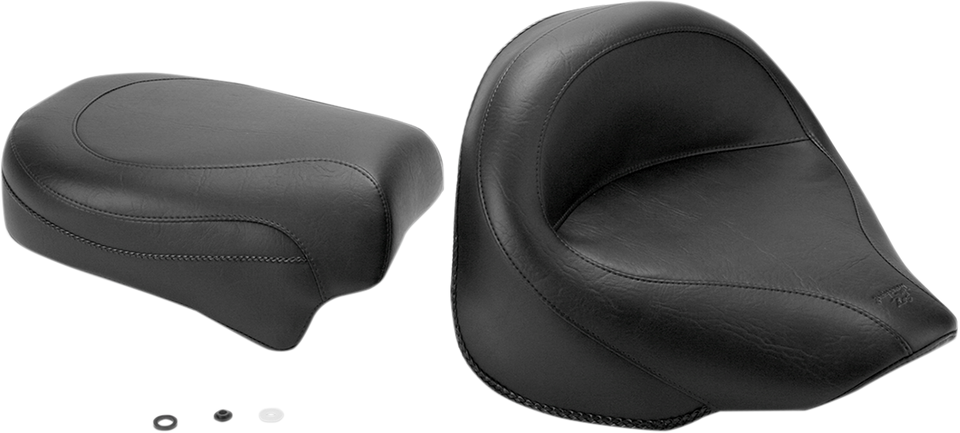 Deeply contoured front bucket; passenger seat angles forward to support the rider's backPremium-quality, expanded vinyl coverBuilt-in steel support wings in the passenger seatVintage has no studs or conchos for a clean, smooth lookMade in the U.S.A.Specs