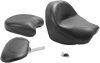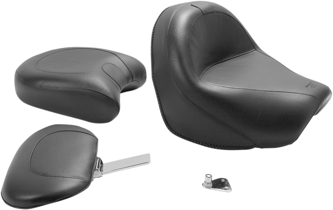 Deeply contoured front bucket; passenger seat angles forward to support the rider's backPremium-quality, expanded vinyl coverBuilt-in steel support wings in the passenger seatVintage has no studs or conchos for a clean, smooth lookMade in the U.S.A.Specs