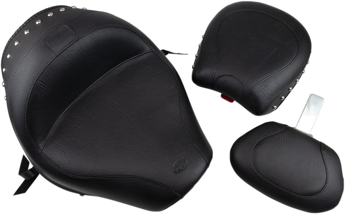 Deeply contoured front bucket; passenger seat angles forward to support the rider's backPremium-quality expanded vinyl coverBuilt-in steel support wings in the passenger seatBackrest folds completely forward for ease of getting on motorcycleRounded thumb screw adjusts backrest forward and back up to 2" while you are seatedMade in the U.S.A.Specs