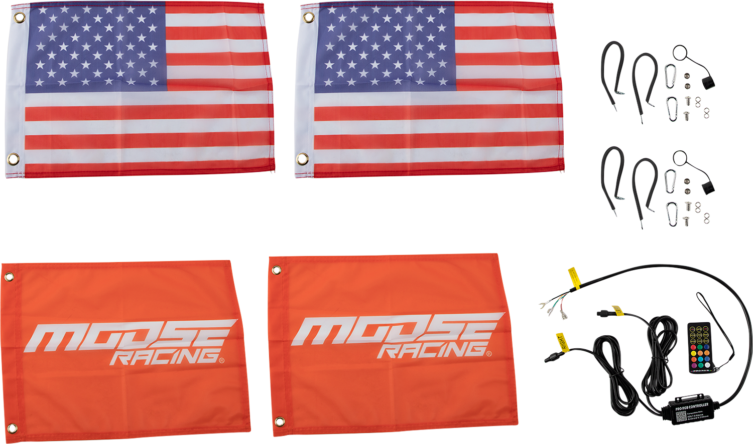 • Includes: 2 whip lights, remote, wiring harness, Moose flags, American flags, dust caps, flag hardware and install instructions