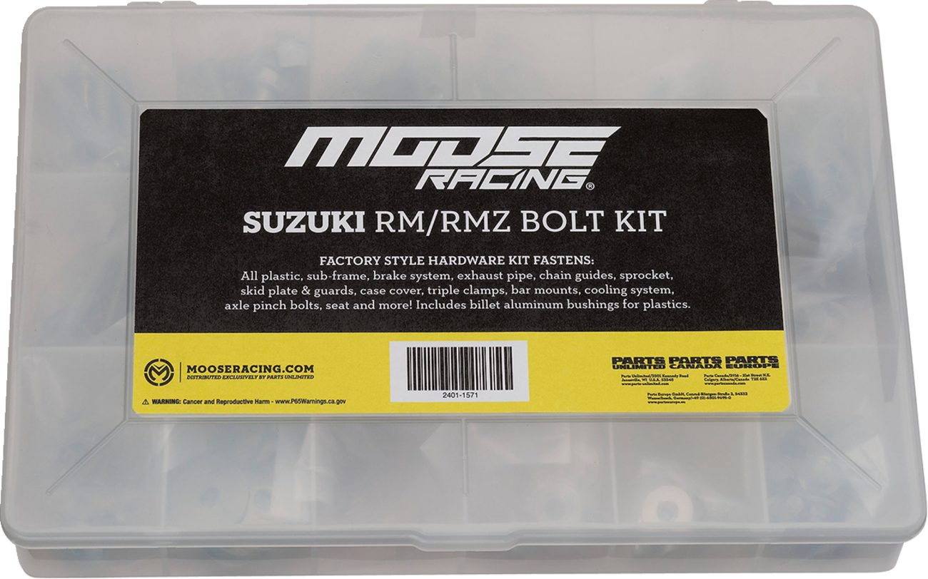 Includes over 178 pieces hardware including shroud bolts, seat bolts, sub-frame bolts, fork guard bolts, rotor bolts, sprocket bolts, T-nuts, aluminum bushings, rim lock spacers, valve stem parts, Fuji lock nuts, replacement bolts, and misc washersMany of these parts cross over for older models, DR's and other Suzuki dirt bikes