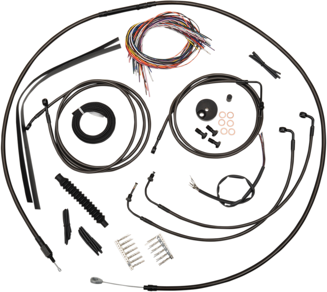 Kits include the correct length braided brake/clutch lines and wire extensions to complete a handlebar swapBlack "T" brake line junction, banjo bolts, fittings and copper crush washers includedMade in the U.S.A.Kits are based on using 2" risers with Ape Hanger handlebarsSpecs