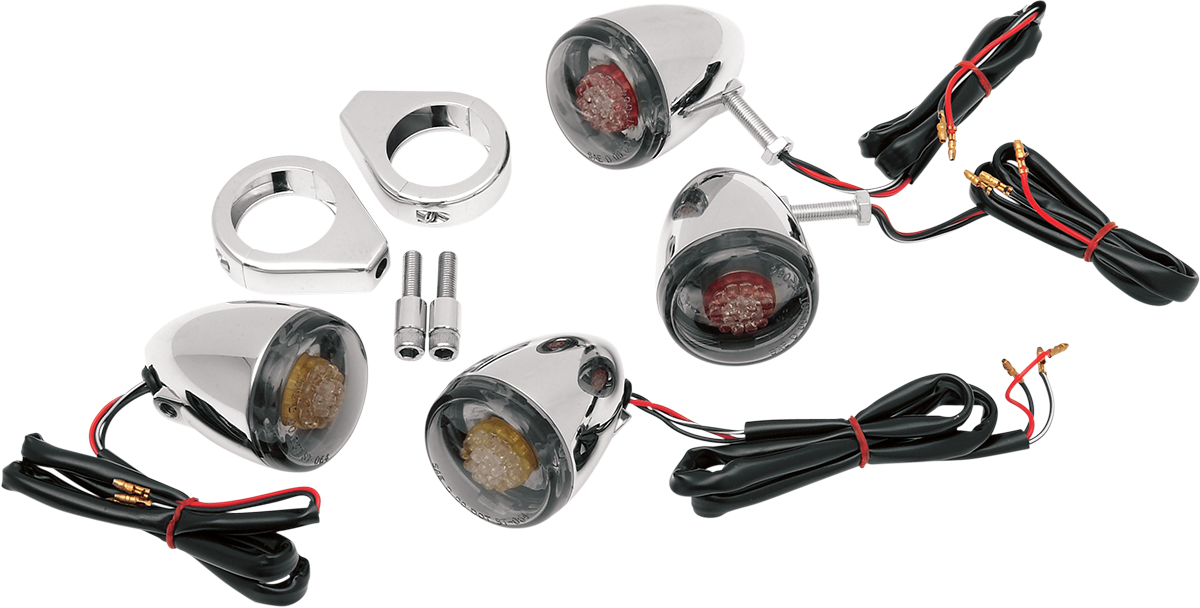Signal kit includes front amber and rear red turn signals with clear lenses, 41mm front clamps, rear mounting brackets and hardwareFront signal kit only with dual-function amber LEDs and clear lenses is available; signal mounts not includedRear signals with dual-function amber or red LEDs and clear lenses are also available separately; mounting brackets must be purchased separatelyDOT compliant